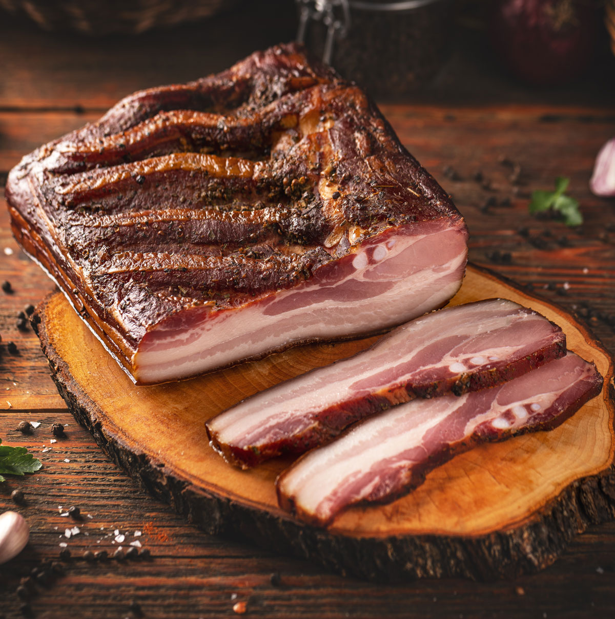 Versione piatta e più semplice della pancetta, ideale per aggiungere struttura e sapore alla cucina quotidiana. La sua lavorazione prevede una salatura equilibrata e stagionatura controllata, ideale per avvolgere arrosti o insaporire zuppe.