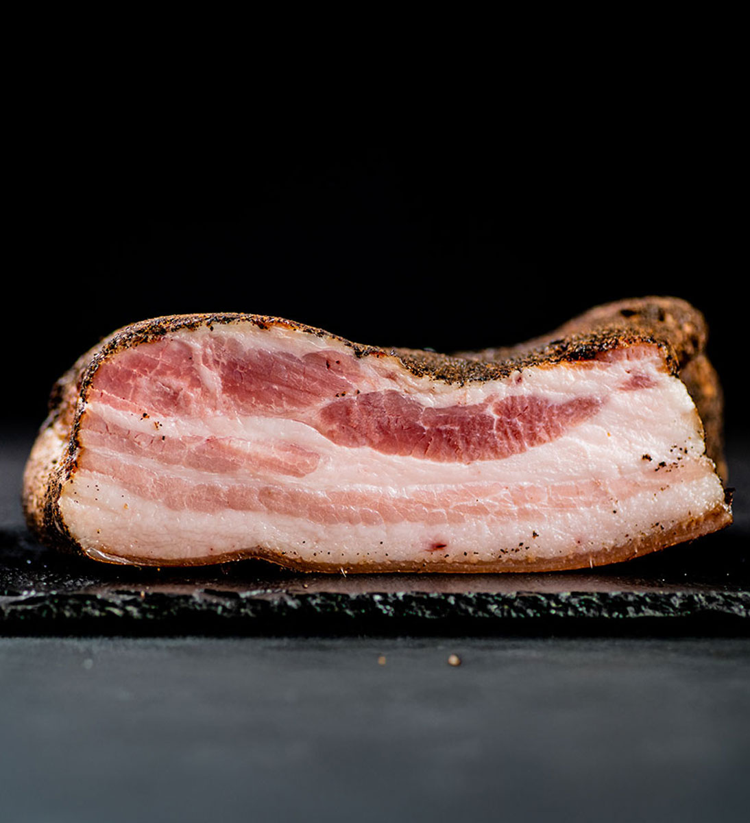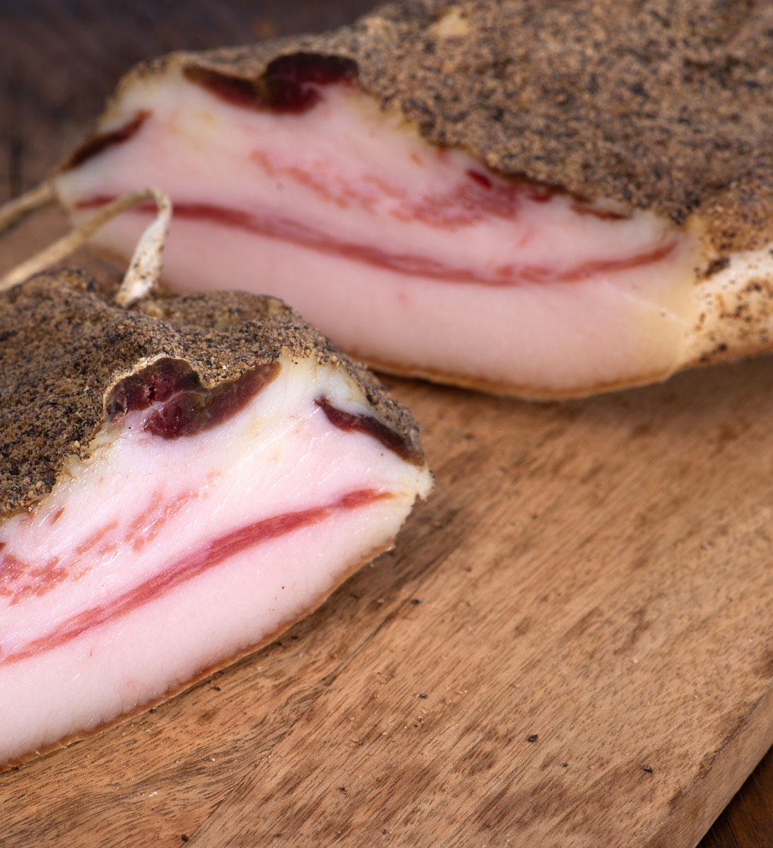 Taglio ricco e sapido della parte ventrale del suino, arrotolato e legato con pepe in grani che, durante la stagionatura, infonde profumo e carattere al grasso esterno. Perfetta nella preparazione di sughi, soffritti e piatti tradizionali.
