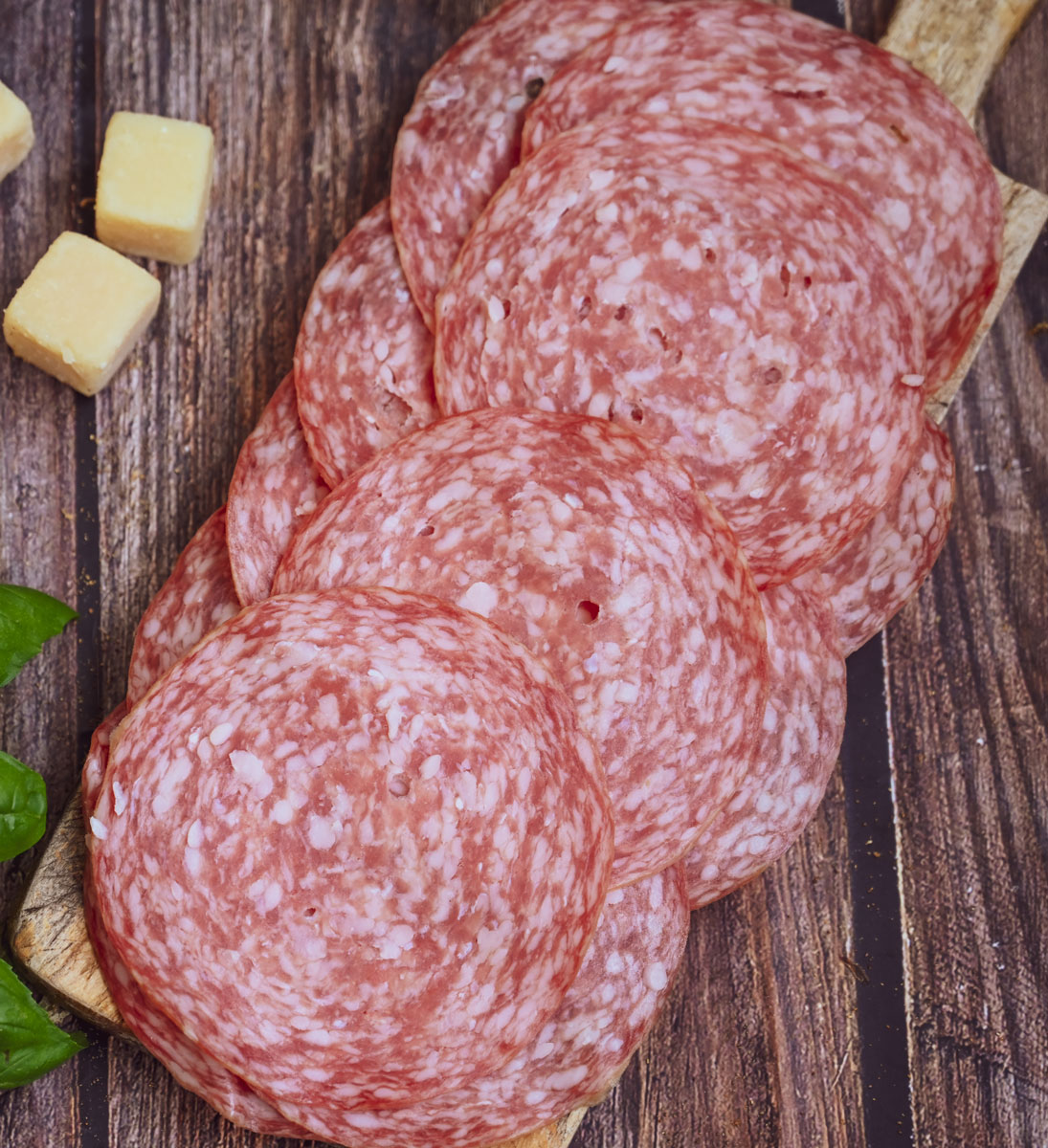 Salume lombardo a grana fine. Miscele di carni suine e bovine sono tritate finemente, insaccate in budello e stagionate da 3 a 9 settimane. Gusto dolce, delicato e senza note affumicate: versatile e adatto a ogni abbinamento.