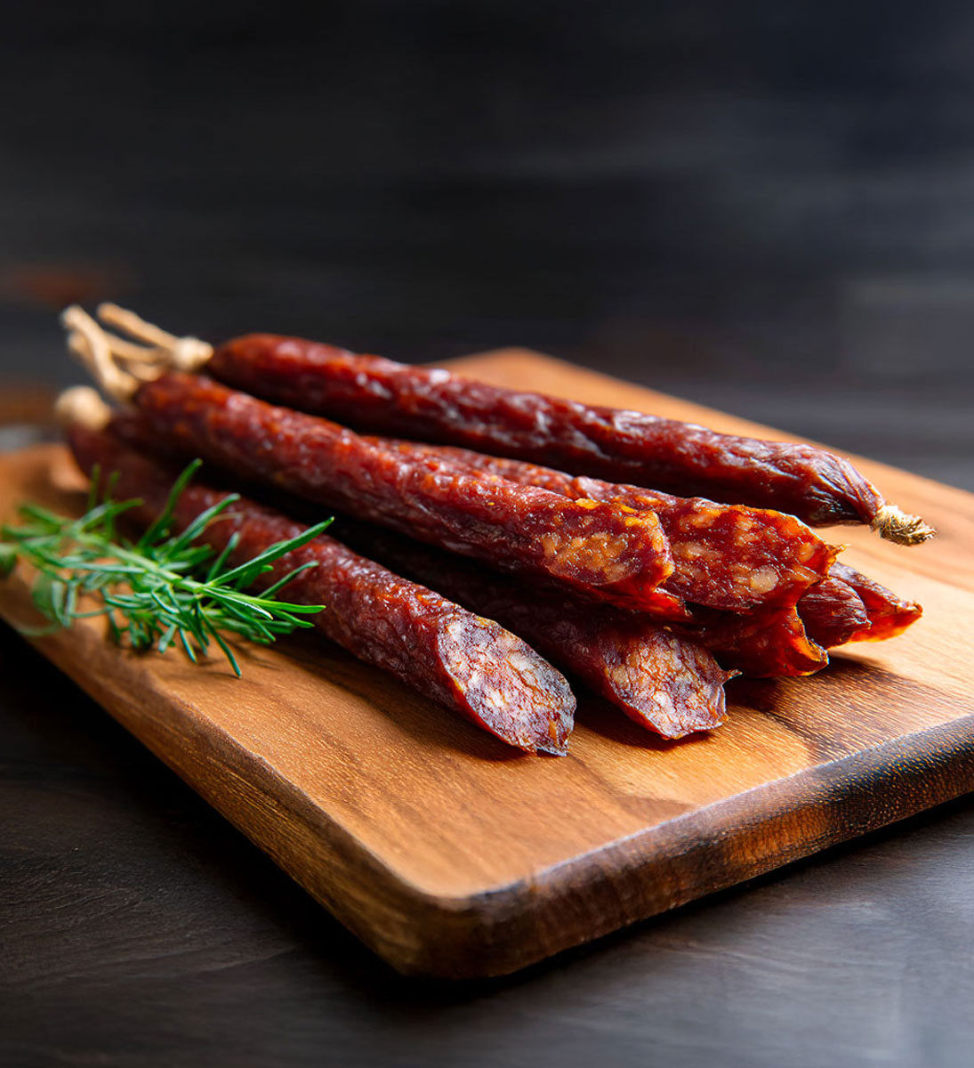 Compatta e saporita, è la versione da “caccia” delle salsicce: pratica e gustosa. La ricetta segue la stessa base (suino, sale, pepe, vino) ma presenta una consistenza più densa. La versione piccante aggiunge carattere, mentre la dolce mantiene delicatezza e aromi bilanciati.